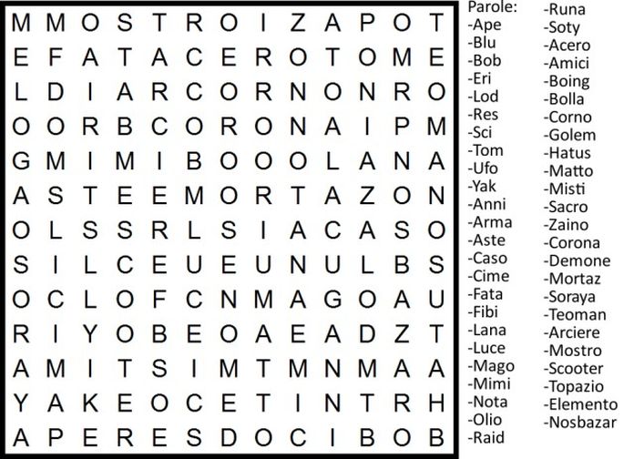 Quando si riesce ad individuare nel riquadro una delle parole elencate a destra, la si segna con una matita, sia nel riquadro che nell’elenco. Il gioco consiste nell’individuare tutte le parole e poi leggere le lettere rimaste, che vengono a formare una nuova parola o una frase, per esempio un proverbio. Per esempio, si può notare che nella terzultima riga, leggendo all’indietro, c’è la parola “Misti”.